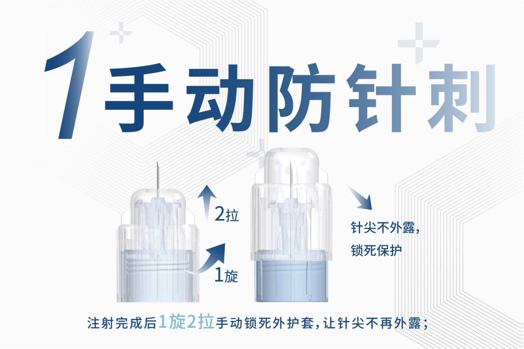 - 手動(dòng)防針刺:注射完成后1旋2拉手動(dòng)鎖緊外護(hù)套,讓針尖不再外露。